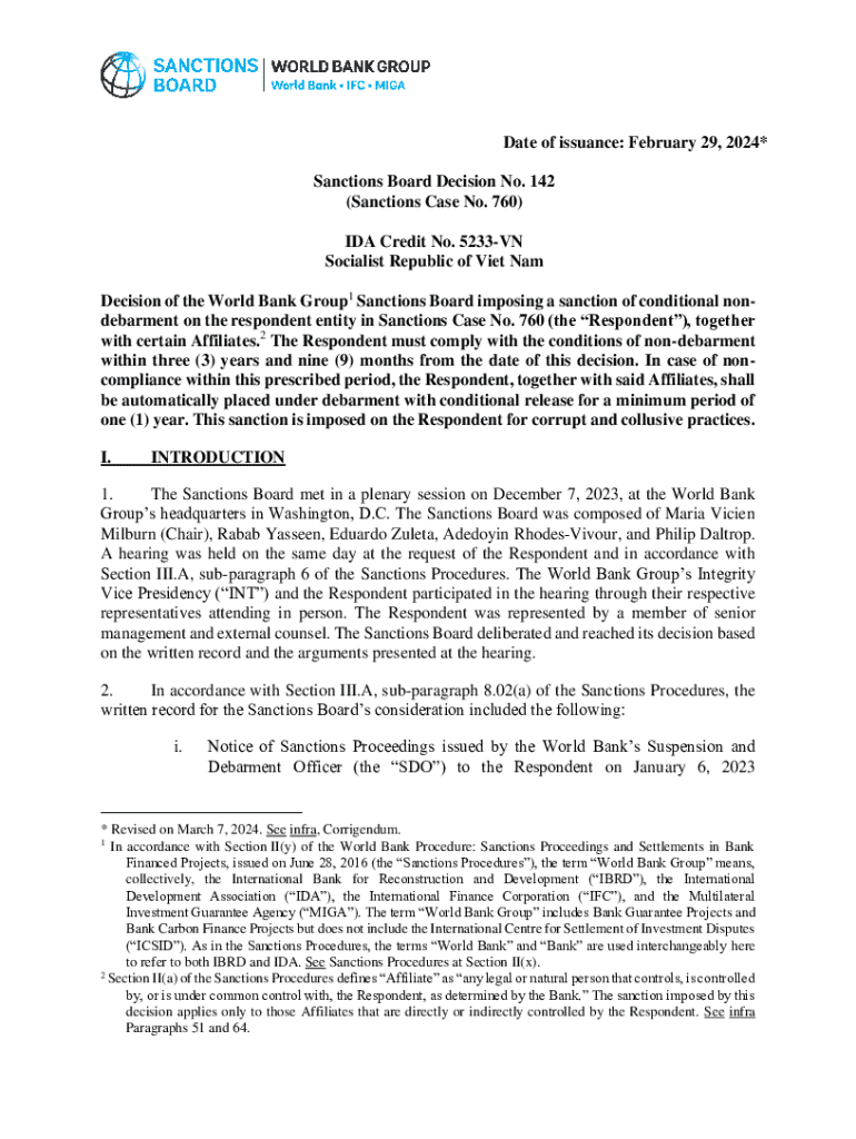 Date of issuance: February 29, 2024* Sanctions Board Decision No. 142 (Sanctions Case No. 760) IDA Credit No. 5233VN Socialist Republic of Viet Nam Decision of the World Bank Group1 Sanctions Board