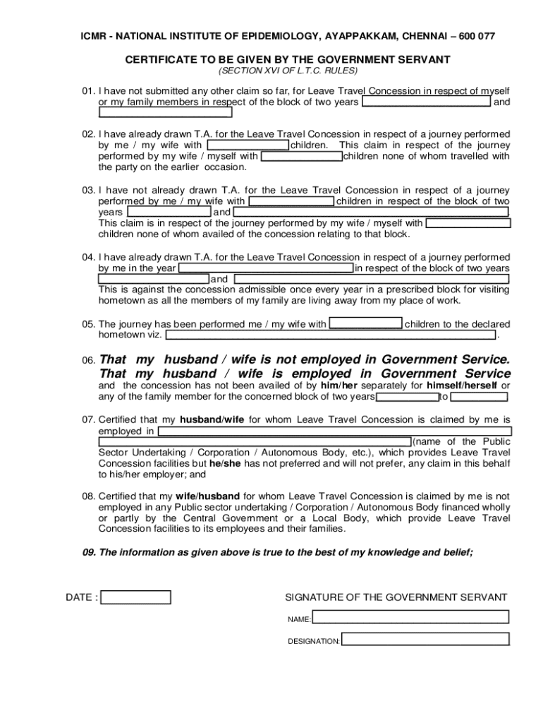 ICMR NATIONAL INSTITUTE OF EPIDEMIOLOGY, AYAPPAKKAM, CHENNAI 600 077CERTIFICATE TO BE GIVEN BY THE GOVERNMENT SERVANT (SECTION XVI OF L.T.C. RULES)01. I have not submitted any other claim so far,