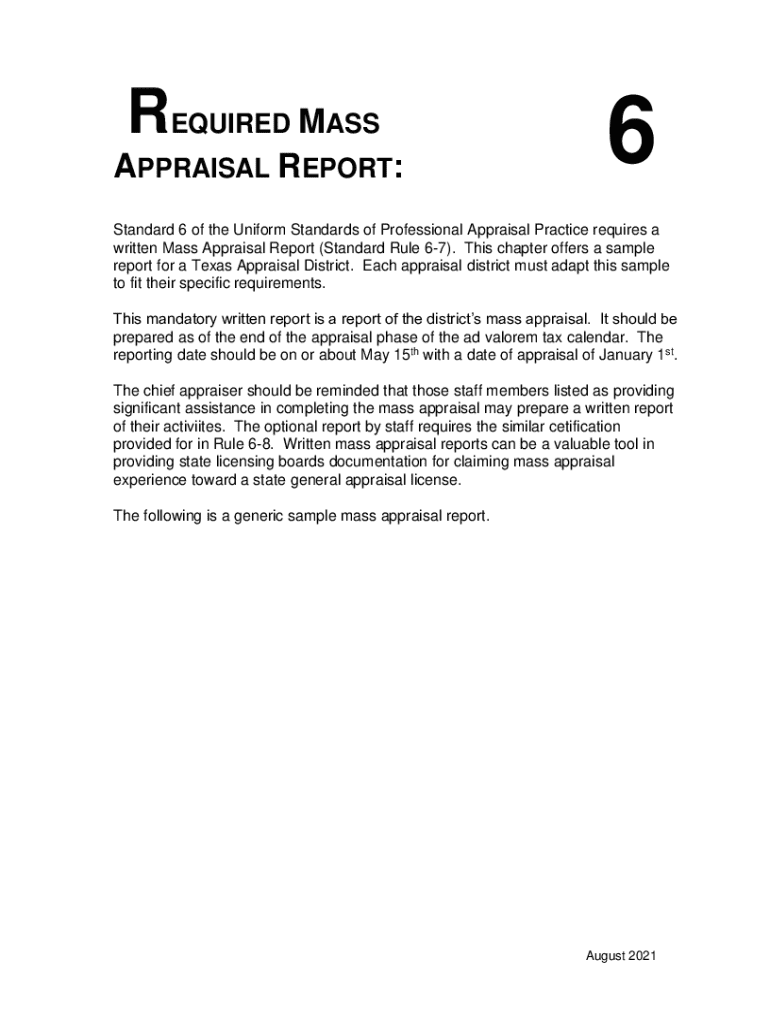 REQUIRED MASS APPRAISAL REPORT:6Standard 6 of the Uniform Standards of Professional Appraisal Practice requires a written Mass Appraisal Report (Standard Rule 67). This chapter offers a sample report