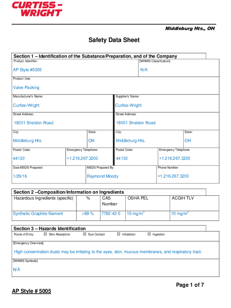 Middleburg Hts., OHSafety Data Sheet Section 1 Identification of the Substance/Preparation, and of the Company Product Identifier:[WHMIS Classification]AP Style #5005N/AProduct Use:Valve Packing Manufacturer\'s