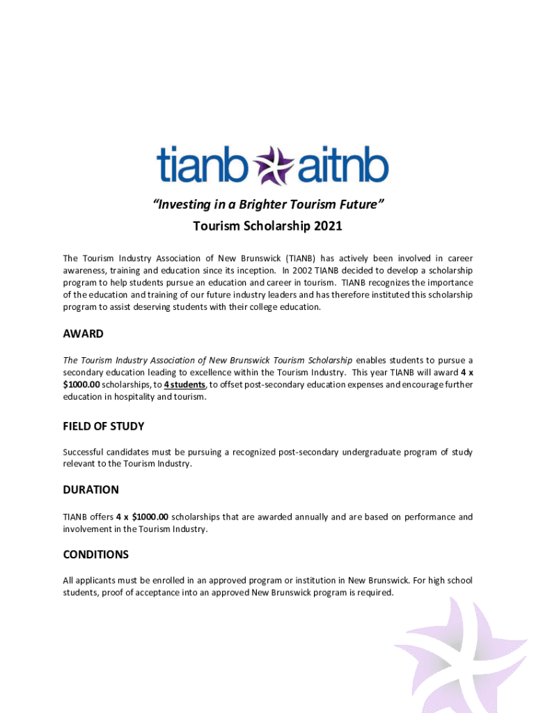 Investing in a Brighter Tourism Future Tourism Scholarship 2021 The Tourism Industry Association of New Brunswick (TIANB) has actively been involved in career awareness, training and education since