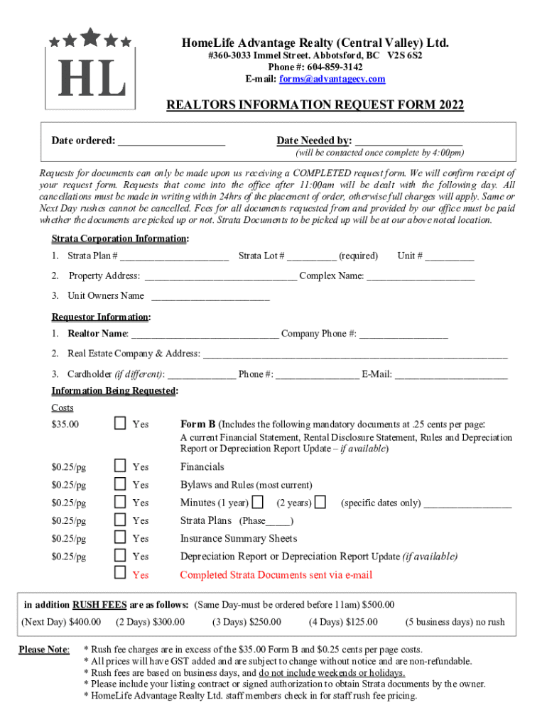 HomeLife Advantage Realty (Central Valley) Ltd. #3603033 Immel Street. Abbotsford, BC V2S 6S2 Phone #: 6048593142 Email: forms@advantagecv.comREALTORS INFORMATION REQUEST FORM 2022 Date ordered: ___Date