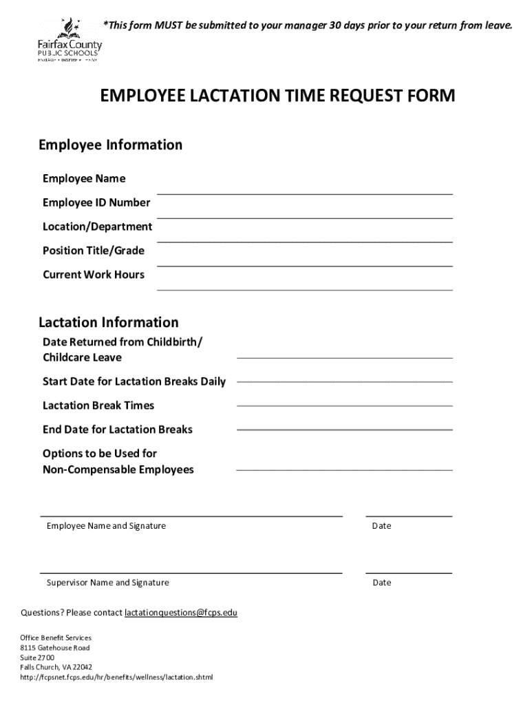 *This form MUST be submitted to your manager 30 days prior to your return from leave.EMPLOYEE LACTATION TIME REQUEST FORM Employee Information Employee Name Employee ID Number Location/Department