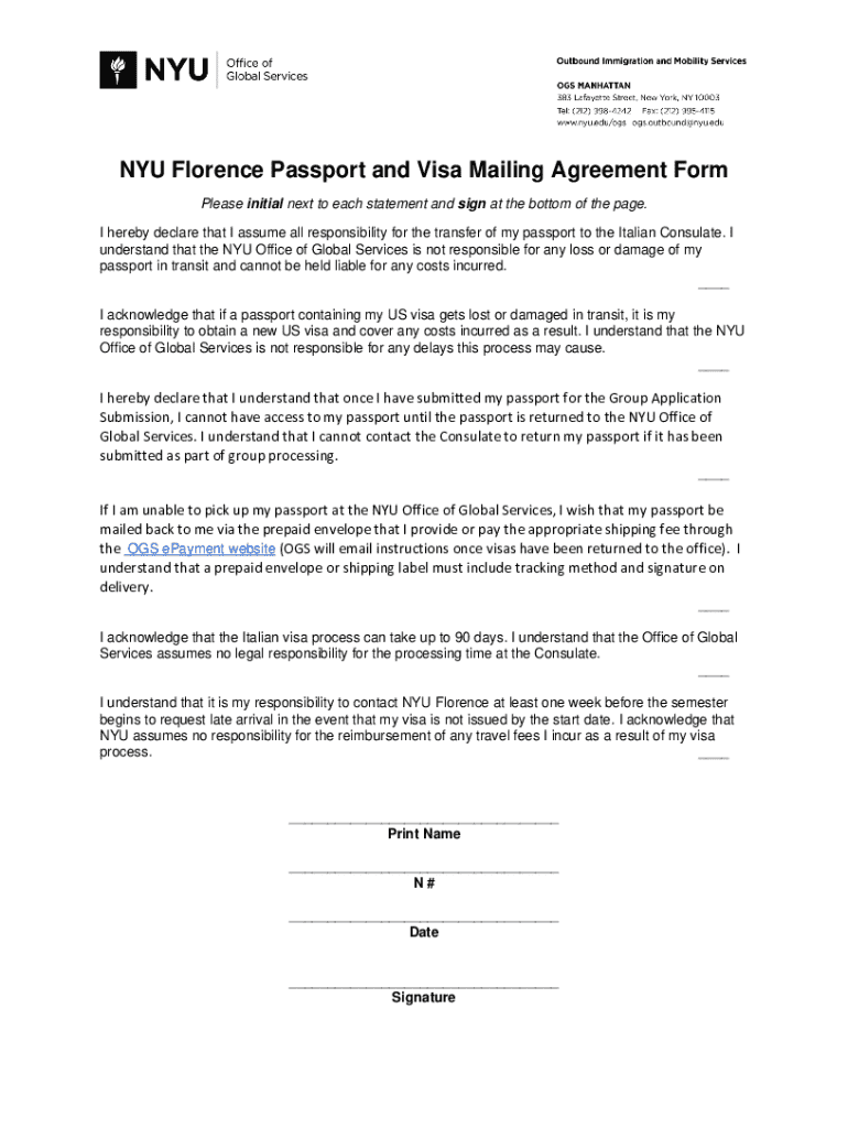 Get the free NYU Florence Passport and Visa Mailing Agreement Form