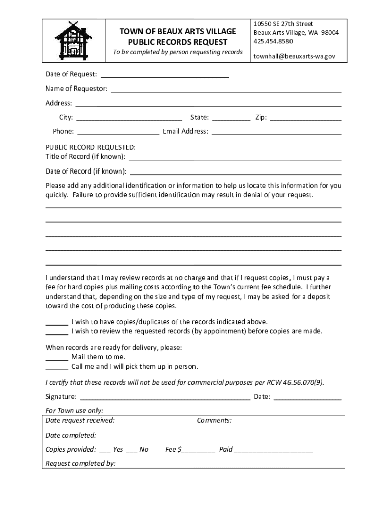 TOWN OF BEAUX ARTS VILLAGE PUBLIC RECORDS REQUEST To be completed by person requesting records10550 SE 27th Street Beaux Arts Village, WA 98004 425.454.8580 townhall@beauxartswa.govDate of Request: