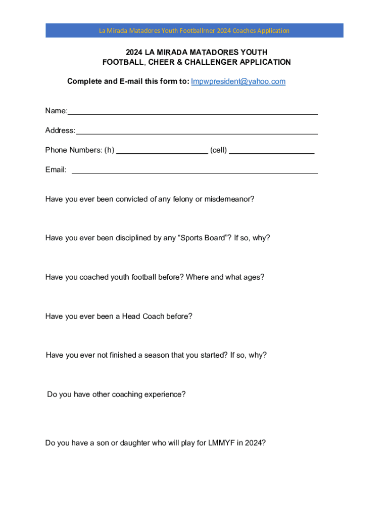 La Mirada Matadors Youth Footballer 2024 Coaches Application2024 LA MIRADA MATADORS YOUTH