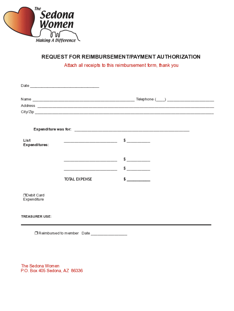 REQUEST FOR REIMBURSEMENT/PAYMENT AUTHORIZATION Attach all receipts to this reimbursement form, thank youDate ___ Name ___ Telephone (___) ___ Address ___ City/Zip ___Expenditure was for: ___ List