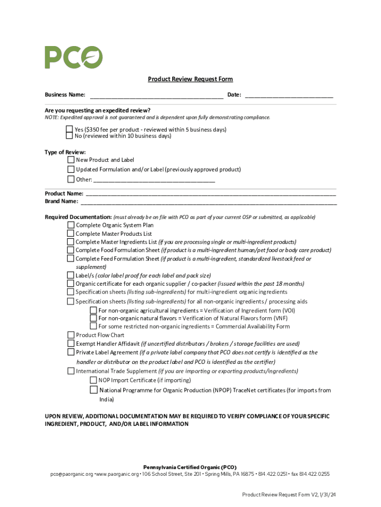 Get the free Product Review Request Form - PCO