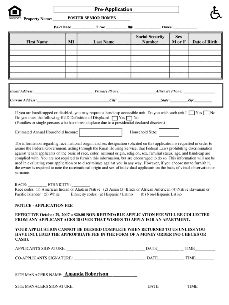 PreApplication Property Name:FOSTER SENIOR HOMES Paid Date ___ Time ___ R# ___ Owes ___First NameMIEmail Address: Current Address:Last Name___Social Security NumberPrimary Phone:___City:Sex M or FAlternate