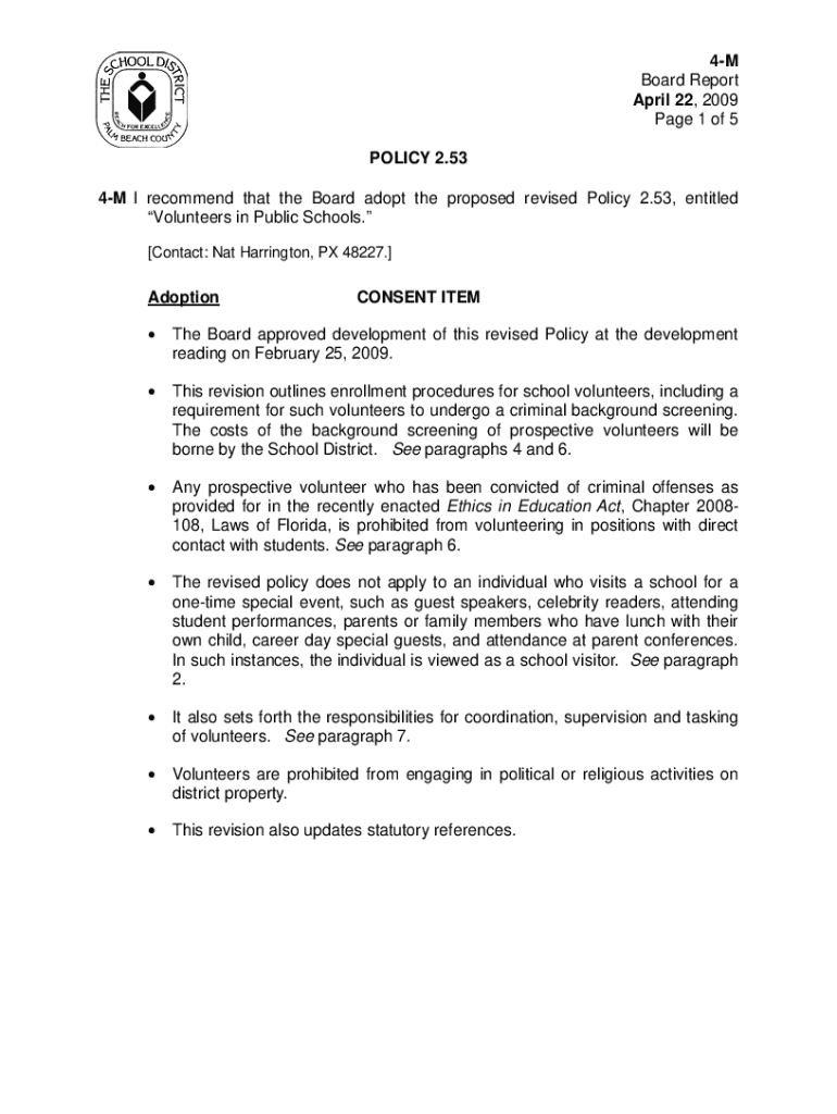 4M Board Report April 22, 2009 Page 1 of 5 POLICY 2.53 4M I recommend that the Board adopt the proposed revised Policy 2.53, entitled Volunteers in Public Schools. [Contact: Nat Harrington, PX 48227.]AdoptionCONSENT