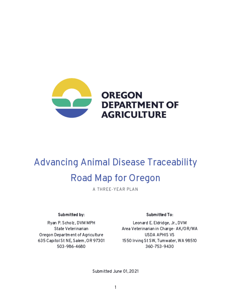 Advancing Animal Disease Traceability Road Map for Oregon A THREEYEAR PLANSubmitted by:Submitted To:Ryan P. Scholz, DVM MPH State Veterinarian Oregon Department of Agriculture 635 Capitol St NE, Salem,