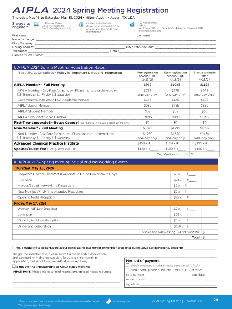 2024 Spring Meeting Registration Thursday, May 16 to Saturday, May 18, 2024 Hilton Austin Austin, TX USA3 ways to register:(1) Register Online: Go to www.aipla.org Credit Card Payment Only(3) Mail