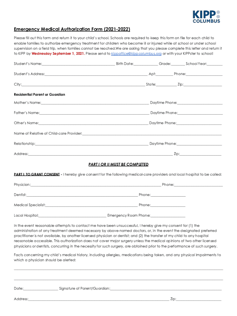 Emergency Medical Authorization Form (20212022) Please fill out this form and return it to your childs school. Schools are required to keep this form on file for each child to enable families to authorize
