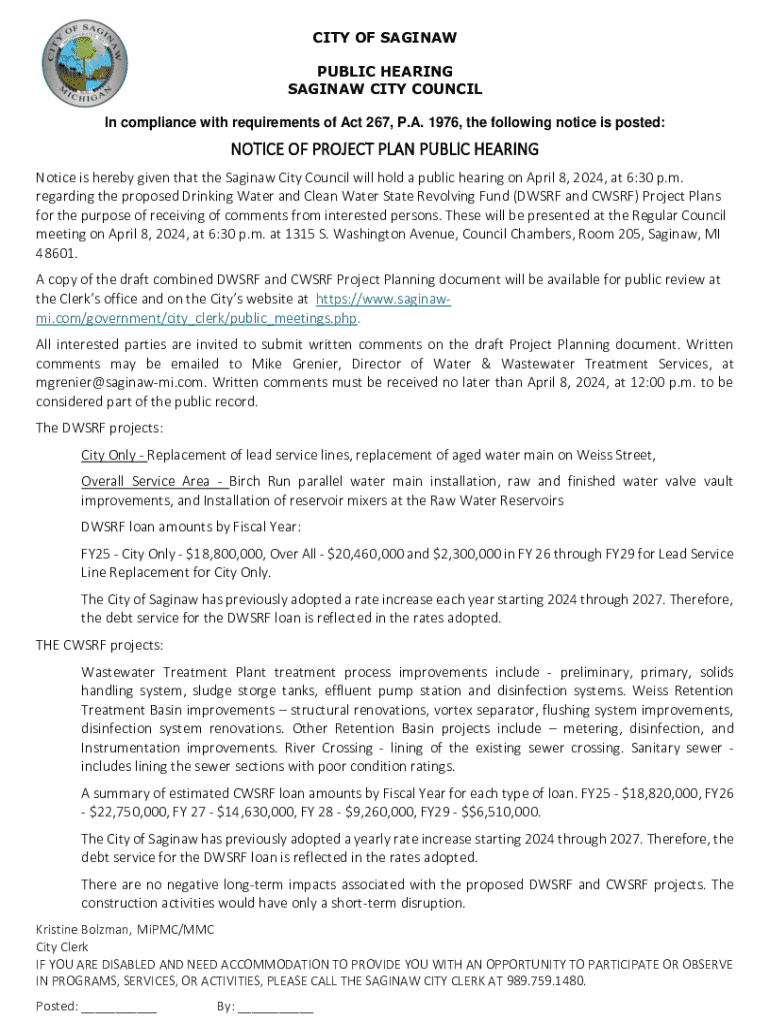 In compliance with requirements of Act 267, P.A. 1976, the following notice is posted:NOTICE OF PROJECT PLAN PUBLIC HEARING