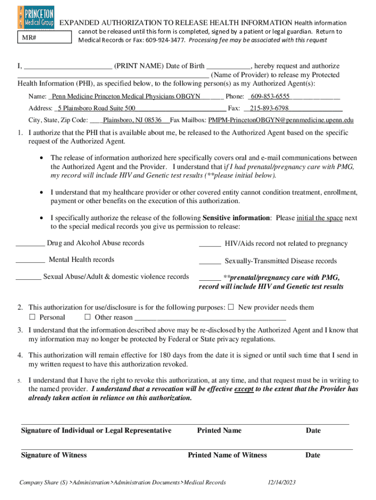 EXPANDED AUTHORIZATION TO RELEASE HEALTH INFORMATION Health information cannot be released until this form is completed, signed by a patient or legal guardian. Return to Medical Records or Fax: 6099243477.