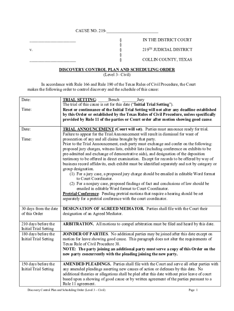 TX Discovery Control Plan and Scheduling Order (Level 3 - Civil) - Collin County Form Versions