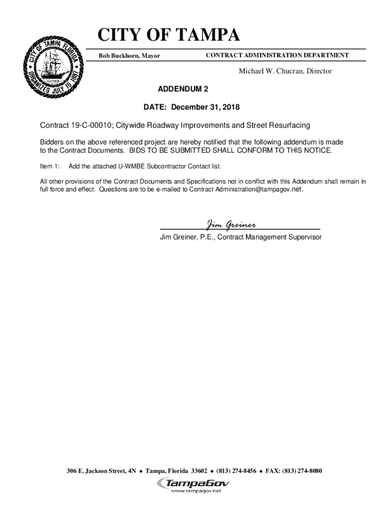 CITY OF TAMPA Bob Buck horn, MayorCONTRACT ADMINISTRATION DEPARTMENT Michael W. Churn, Director ADDENDUM 2 DATE: December 31, 2018, Contract 19C00010; Citywide Roadway Improvements and Street Resurfacing