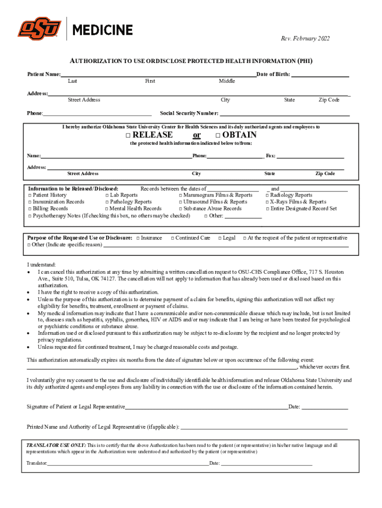 Get the free I hereby authorize Oklahoma State University Center for Health Sciences and its duly...