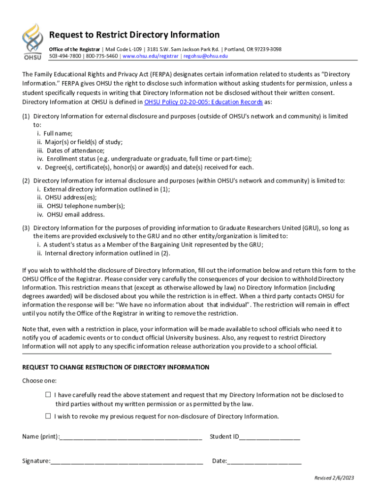 Get the free Online Request to Restrict Directory Information - OHSU ...