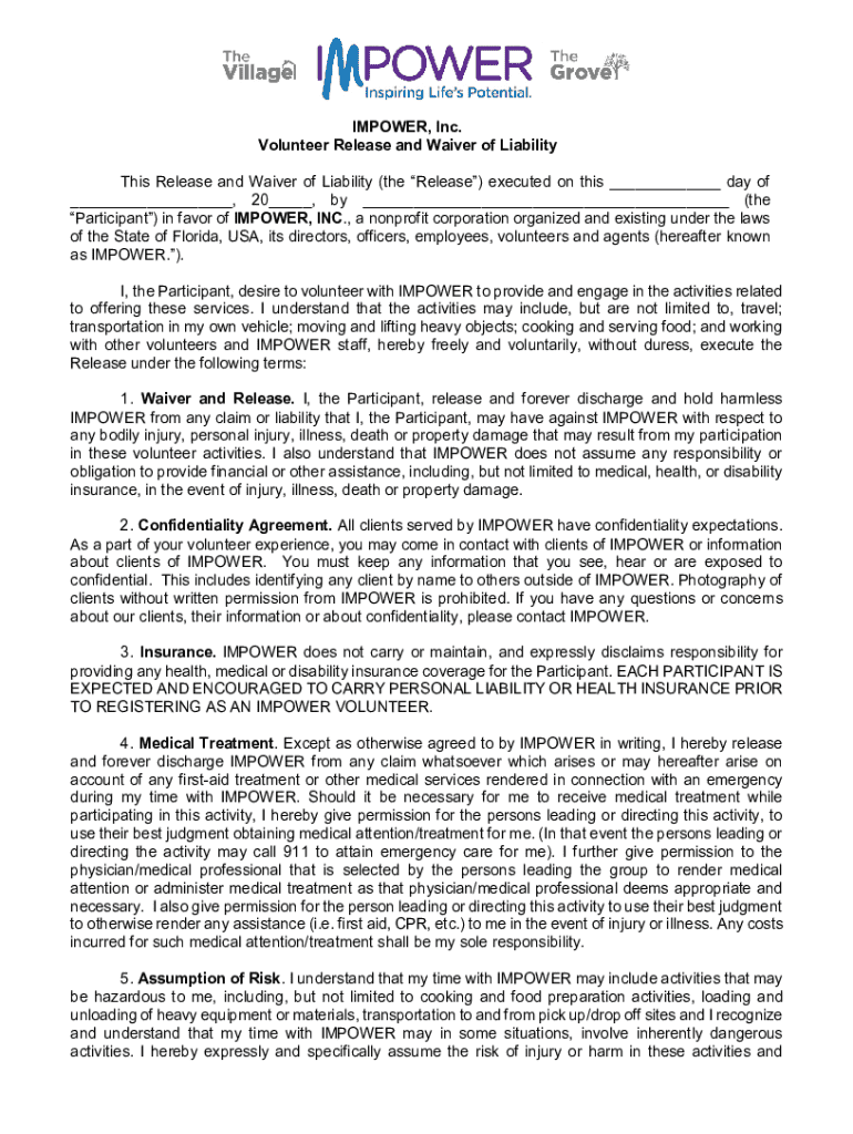 EMPOWER, Inc. Volunteer Release and Waiver of Liability This Release and Waiver of Liability (the Release) executed on this ___ day of ___, 20___, by ___ (the Participant) in favor of EMPOWER, INC.,