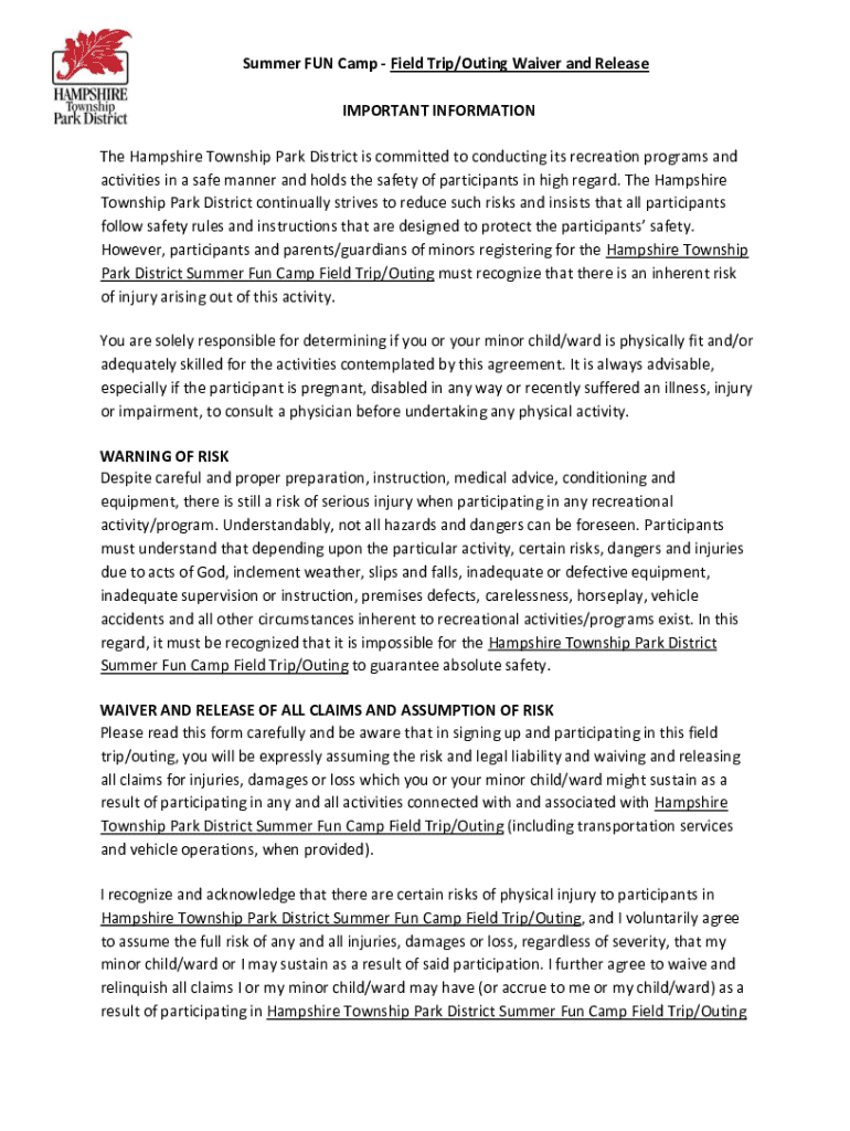 Summer FUN Camp Field Trip/Outing Waiver and Release IMPORTANT INFORMATION The Hampshire Township Park District is committed to conducting its recreation programs and activities safely and holds the
