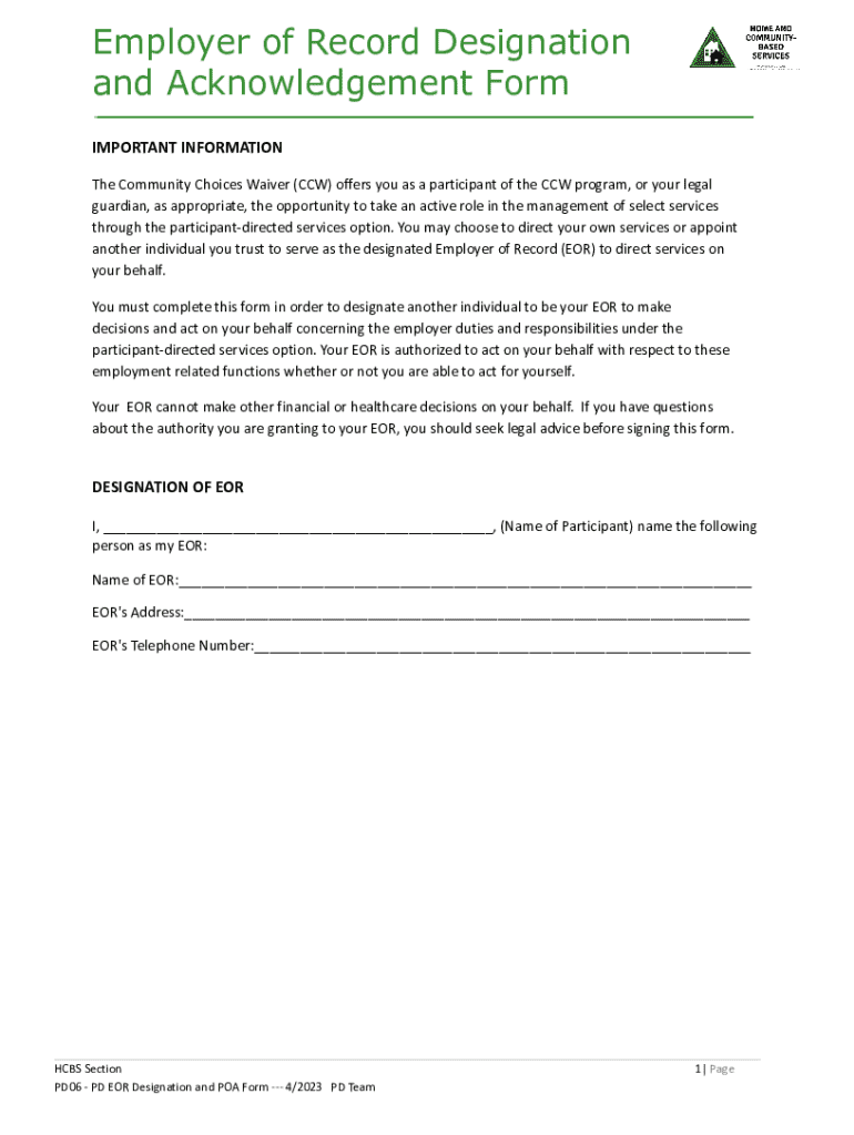 Employer of Record Designation and Acknowledgement Form IMPORTANT INFORMATION The Community Choices Waiver (CCW) offers you as a participant of the CCW program, or your legal guardian, as appropriate,
