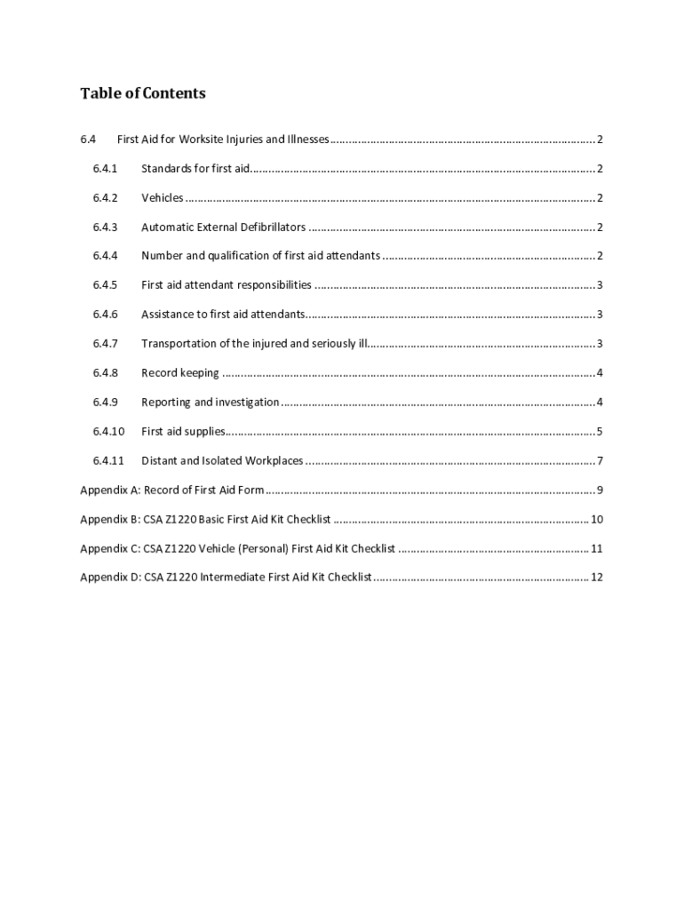Table of Contents 6.4First Aid for Worksite Injuries and Illnesses ...................................................................................... 26.4.1Standards for first aid................................................................................................................