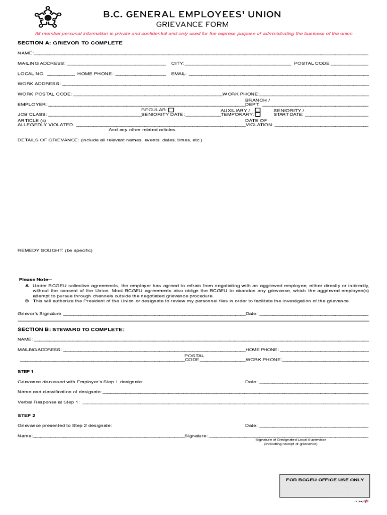 B.C. GENERAL EMPLOYEES\' UNION GRIEVANCE FORM INSTRUCTIONS All member personal information is private and confidential and only used for the express purpose of administrating the business of the unionInstructions