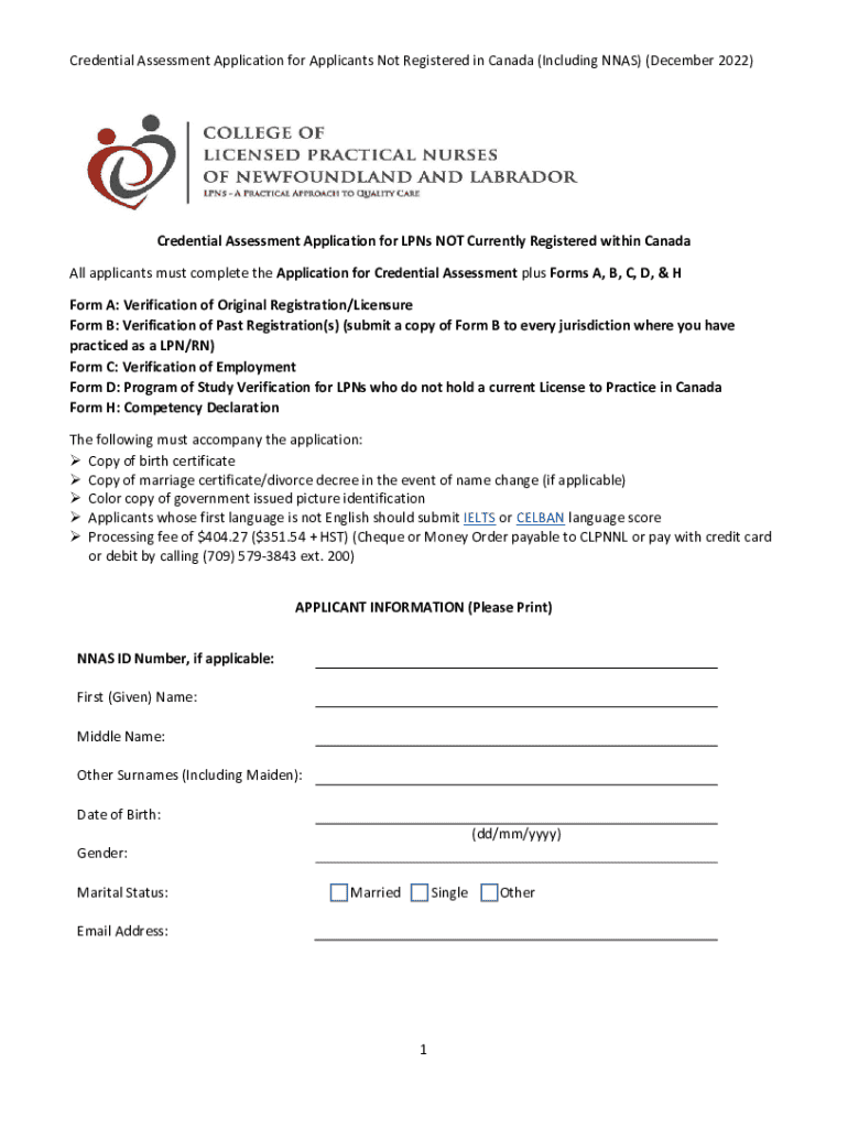 Credential Assessment Application for Applicants Not Registered in Canada (Including NNAS) (December 2022)Credential Assessment Application for LPNs NOT Currently Registered within Canada All applicants