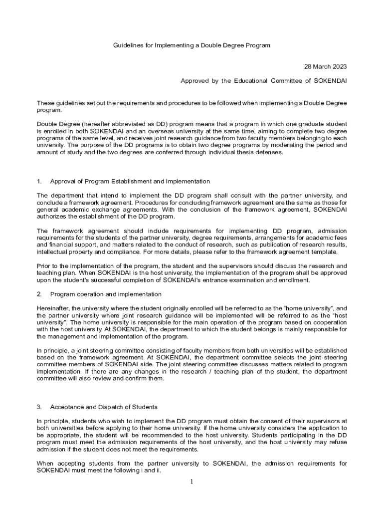 Guidelines for Implementing a Double Degree Program 28 March 2023 Approved by the Educational Committee of SOKENDAI These guidelines set out the requirements and procedures to be followed when implementing