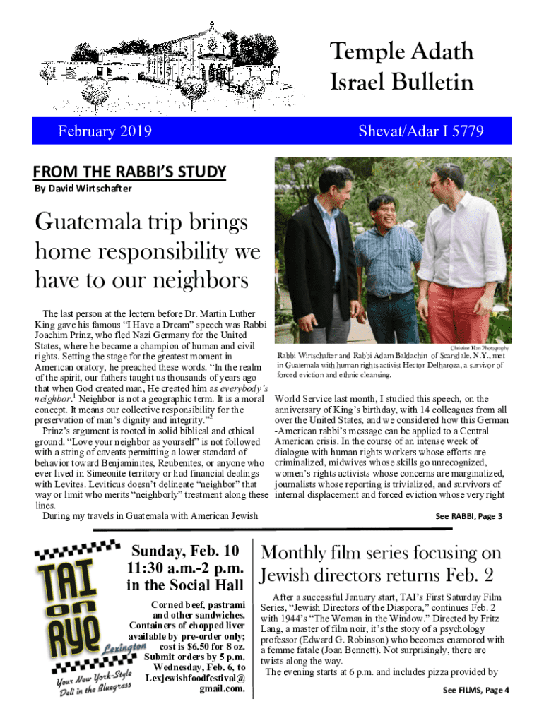 Temple Adath Israel Bulletin February 2019Shevat/Adar I 5779FROM THE RABBIS STUDY By David WirtschafterGuatemala trip brings home responsibility we have to our neighbors The last person at the lectern
