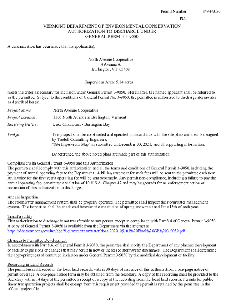 Permit Number:84949050PIN:VERMONT DEPARTMENT OF ENVIRONMENTAL CONSERVATION AUTHORIZATION TO DISCHARGE UNDER GENERAL PERMIT 39050 A determination has been made that the applicant(s): North Avenue Cooperative
