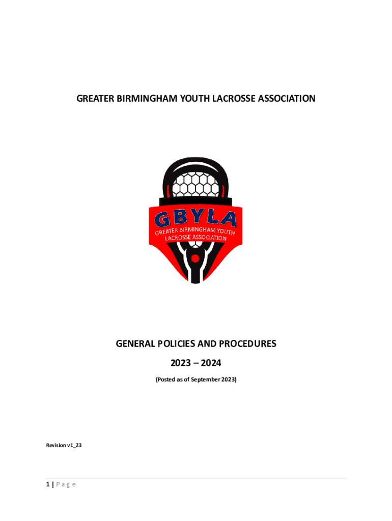 GREATER BIRMINGHAM YOUTH LACROSSE ASSOCIATIONGENERAL POLICIES AND PROCEDURES 2023 2024 (Posted as of September 2023)Revision v1_231|Vegetable of Contents MISSION AND VISION... 3 SPRING SEASON DIVISIONS.