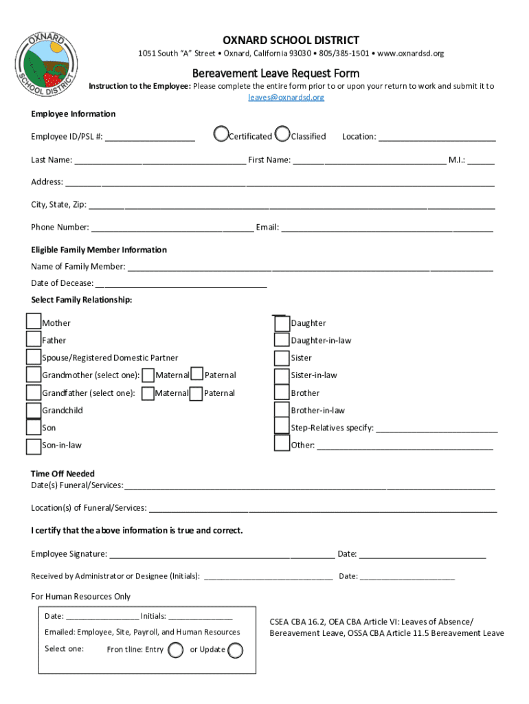 1051 South A Street Oxnard, California 93030 805/3851501 www.oxnardsd.orgBereavement Leave Request Form