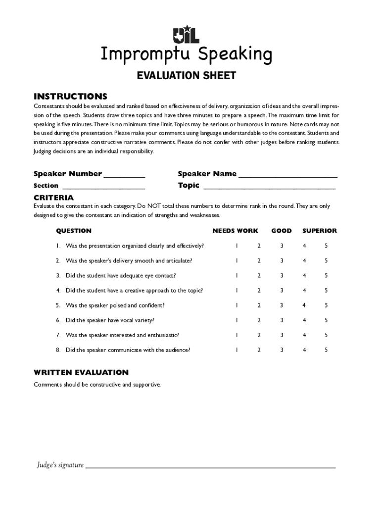 Contestants should be evaluated and ranked based on effectiveness of delivery, organization of ideas and the overall impression of the speech. Students