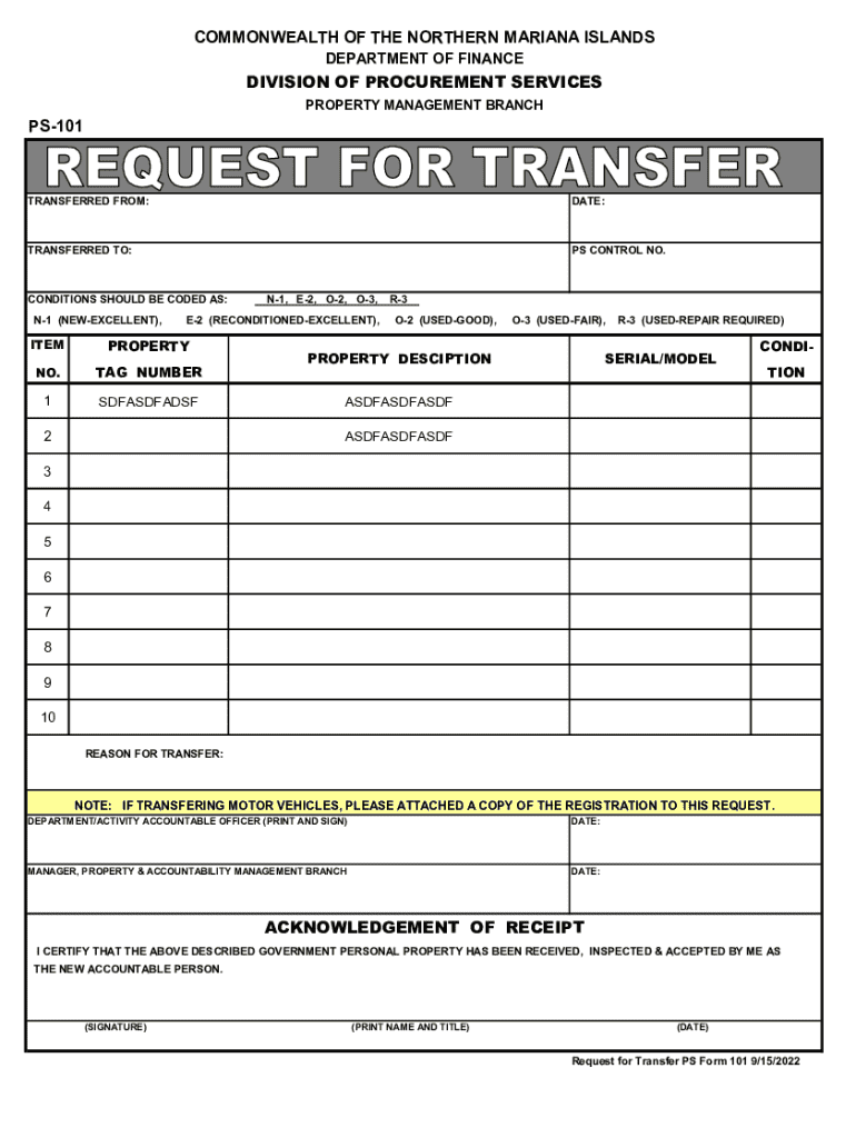 COMMONWEALTH OF THE NORTHERN MARIANA ISLANDS DEPARTMENT OF FINANCEDIVISION OF PROCUREMENT SERVICES PROPERTY MANAGEMENT BRANCHPS101TRANSFERRED FROM:DATE:TRANSFERRED TO:PS Controls NO.CONDITIONS SHOULD