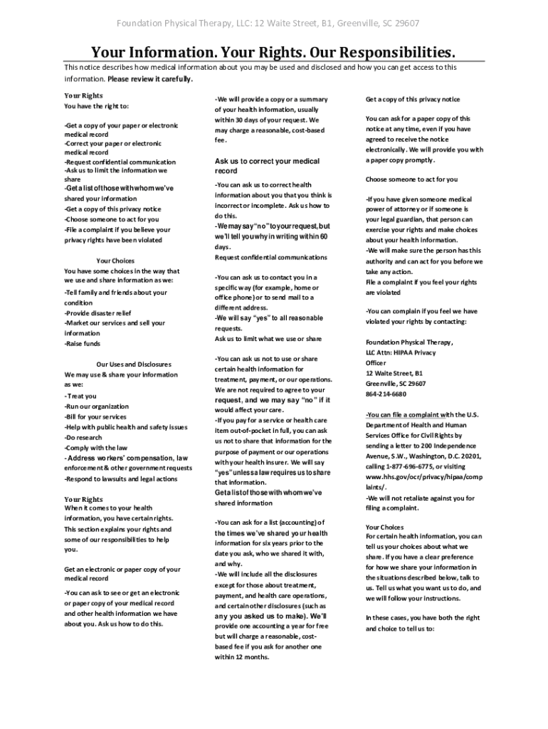 Foundation Physical Therapy, LLC: 12 Waite Street, B1, Greenville, SC 29607Your Information. Your Rights. Our Responsibilities. This notice describes how medical information about you may be used