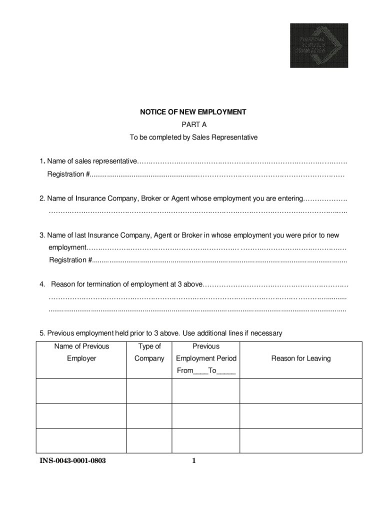 NOTICE OF NEW EMPLOYMENT PART A To be completed by Sales Representative 1. Name of sales representative. Registration #......................................................... 2. Name of Insurance
