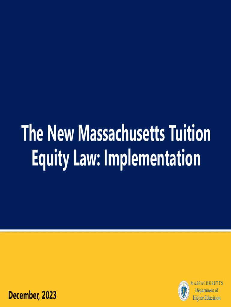The New Massachusetts Tuition Equity Law: ImplementationDecember, 2023Tuition Equity Summary of New Law* Signed into law on August 10, 2023 (FY24 Budget), but effective as of July 1, 2023 Establishes