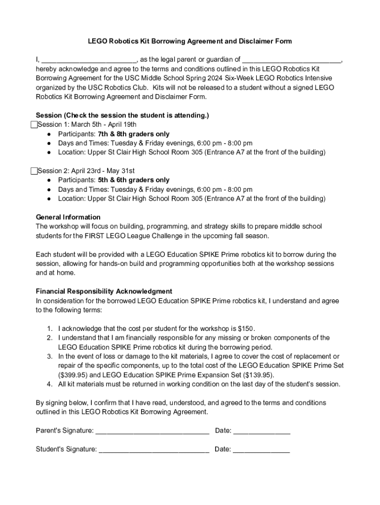 LEGO Robotics Kit Borrowing Agreement and Disclaimer Form