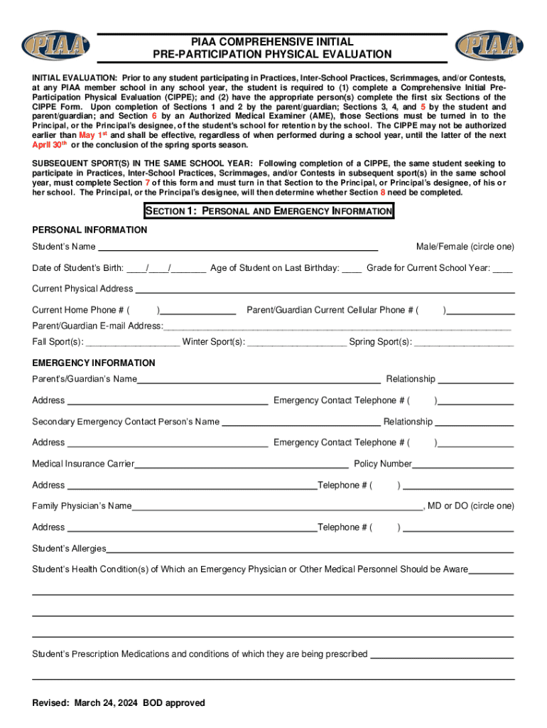 INITIAL EVALUATION: Prior to any student participating in Practices, InterSchool Practices, Scrimmages, and/or Contests,