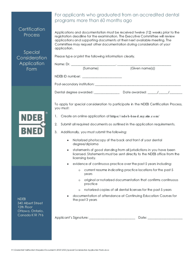 For applicants who graduated from an accredited dental programs more than 60 months ago Certification ProcessSpecial Consideration Application FormApplications and documentation must be received twelve