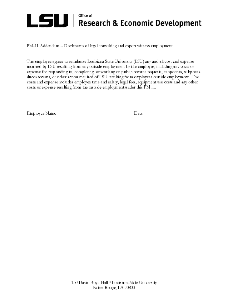 PM11 Addendum Disclosures of legal consulting and expert witness employment The employee agrees to reimburse Louisiana State University (LSU) any and all cost and expense incurred by LSU resulting