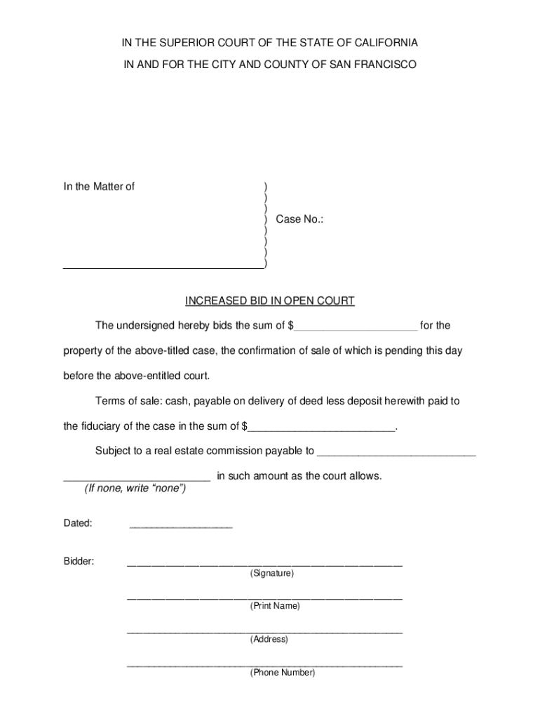 Required information includes the bidder's name, original bid details, new bid amount, the date of the increase, and any additional terms or conditions if necessary.
