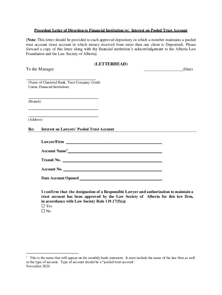 Precedent Letter of Direction to Financial Institution re: Interest on Pooled Trust Account [Note: This letter should be provided to each approved depository in which a member maintains a pooled trust