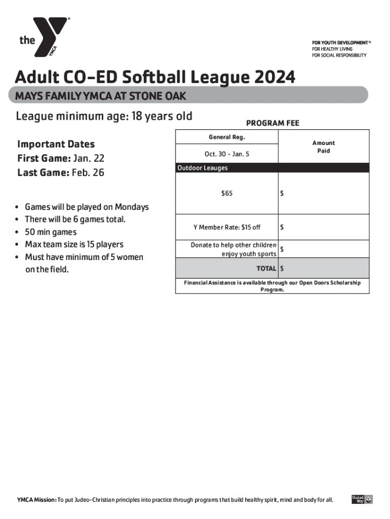 Adult COED Softball League 2024 MAYS FAMILY YMCA AT STONE League minimum age: 18 years old Important Dates First Game: Jan. 22 Last Game: Feb. 26 Games will be played on Mondays There will be 6 games