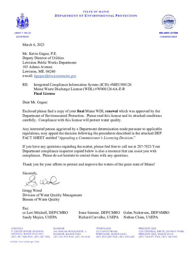 STATE OF MAINEDEPARTMENT OF ENVIRONMENTAL PROTECTIONJANET T. MILLSMELANIE LOYZIMGOVERNORCOMMISSIONERMarch 6, 2023