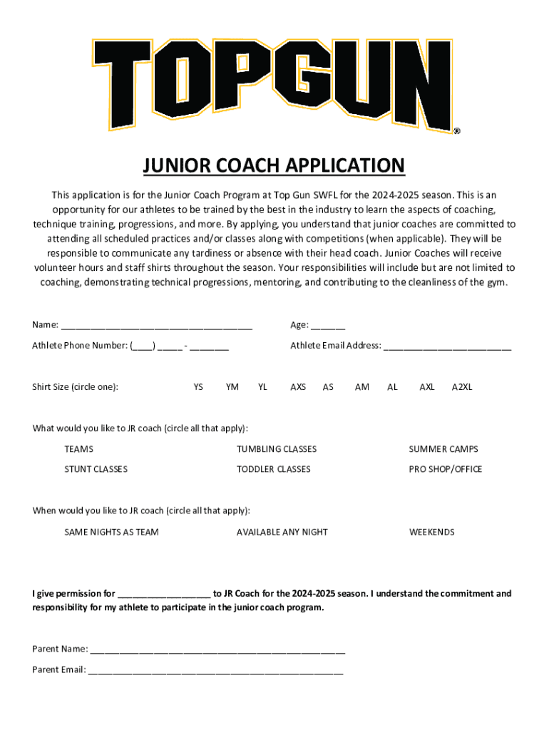 JUNIOR COACH APPLICATION This application is for the Junior Coach Program at Top Gun SWL for the 20242025 season. This is an opportunity for our athletes to be trained by the best in the industry