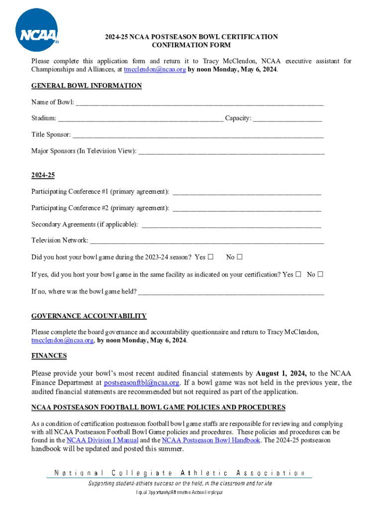 202425 NCAA POSTSEASON BOWL CERTIFICATION CONFIRMATION FORM Please complete this application form and return it to Tracy McClendon, NCAA executive assistant for Championships and Alliances, at tmcclendon@ncaa.org