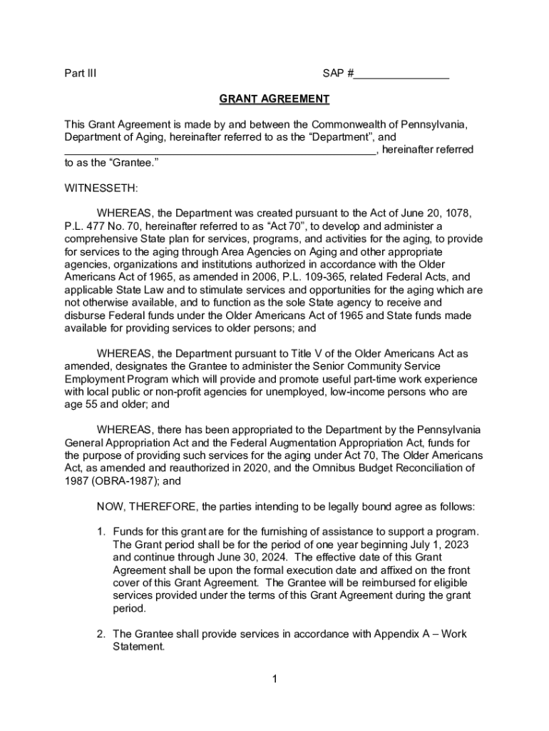 Get the free 1 Part III SAP # GRANT AGREEMENT ...